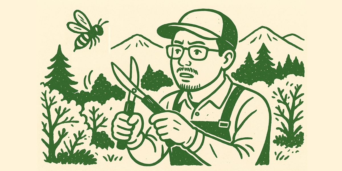 クマ蜂みたいな大きい蜂が飛んで来たら、ハサミで “ちょきんっ” って空中で切るんだよ。払ったりしたら危ないべー。年寄の造園業の人はみんなできるよー